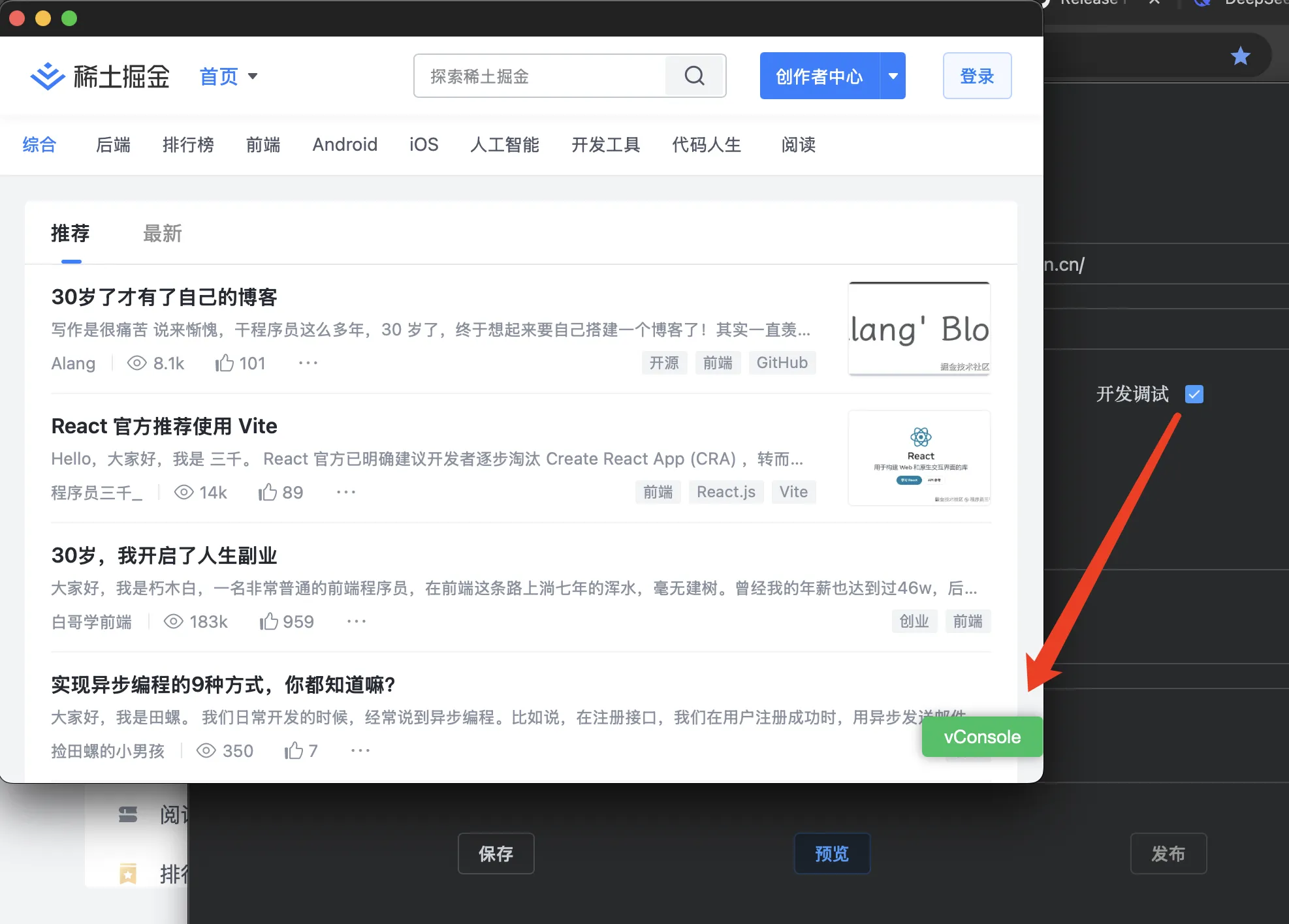 To enable development debugging, check the "Debug Mode" option and click "Preview". A debug button will appear in the lower right corner of the preview window - click it to start debugging.